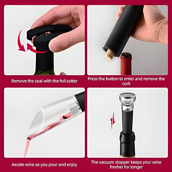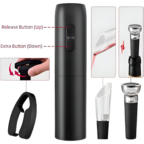 Set 5 u 1 za ljubitelje vina uključuje automatski vadičep, rezač za foliju, aerator za sipanje, vakuumski čep i bazu za odlaganje.