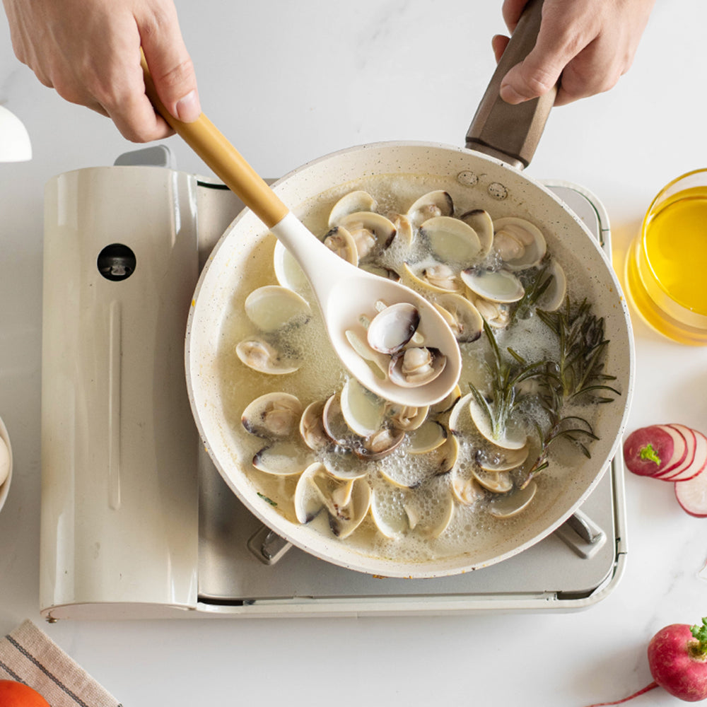 Silikonski alati su nežni prema vašem posuđu i neće ogrebati ili oštetiti površinu. Idealni su za upotrebu sa non-stick tiganjima i loncima.